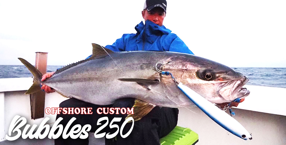 Avec ses 250 mm de longueur et 135 grammes de poids, c'est le leurre de référence lorsque les poissons se nourrissent de proies massives. Le Bubbles250 est incroyablement efficace sur des cibles de premier ordre comme la Sériole (Hiramasa), le Thon rouge XXL, et d'autres carangues. Sa présence dans l'eau est imposante et son action inimitable.